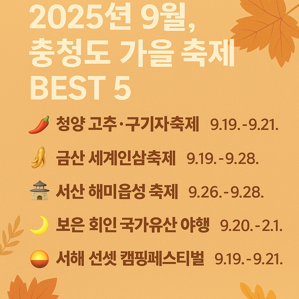 2025년 9월 충청도의 축제는 건강 먹거리(청양·금산), 역사와 전통(서산·보은), **감성 캠핑(태안)**이 조화롭게 어우러져 있습니다.