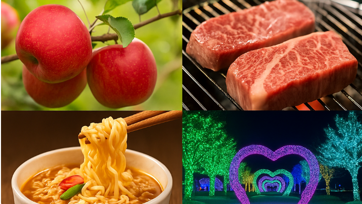 사과의 붉은빛, 약돌한우의 깊은 풍미, 라면의 향기, 밤을 밝히는 빛 축제까지—